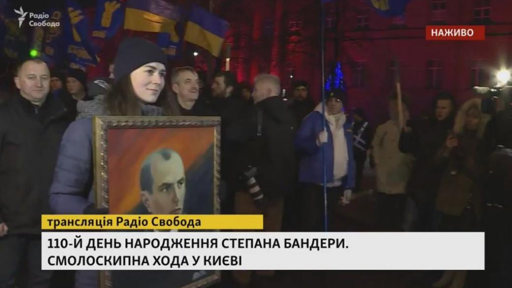 Сегодня, в честь 110-ой годовщины со дня рождения Степана Бандеры в столице Украины состоялось факельное шествие. Видеотрансляцию с мероприятия ведет «Радио Свобода».