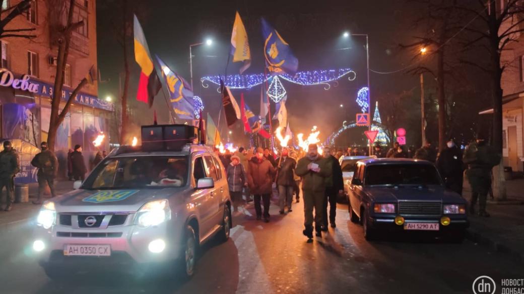В Славянске Донецкой области сегодня вечером, 1 января, местные жители и националисты проводят традиционно факельное шествие, которое посвящается дню рождения Степана Бандеры.