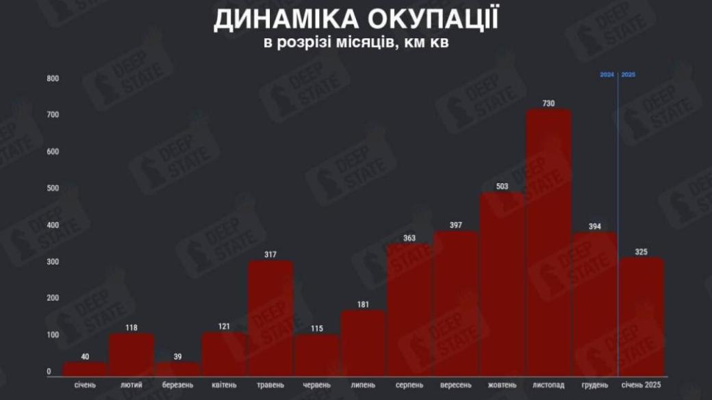 В январе 2025 года российские войска оккупировали 325 квадратных километров украинской территории. Об этом сообщает мониторинговый проект DeepState.