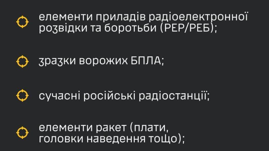По информации ведомства, для анализа специалистам ГУР необходимы: элементы приборов радиоэлектронной разведки и борьбы (РЭР/РЭБ), образцов вражеских БПЛА, современные российские радиостанции, элементы ракет (платы, головки наведения и т.д.), компоненты электроники с военной техники противника и другие современные образцы техники и вооружения российской армии.