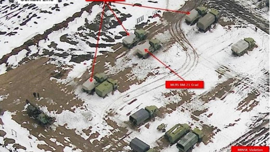 Это фото было сделано беспилотником миссии 21 февраля. Хуг подчеркнул, что в течение прошлой недели наблюдатели зафиксировали 52 единицы вооружения, расположенного в нарушение договоренностей об отводе оружия от линии разграничения. Кроме того, 46 единиц были обнаружены на оккупированных территориях.