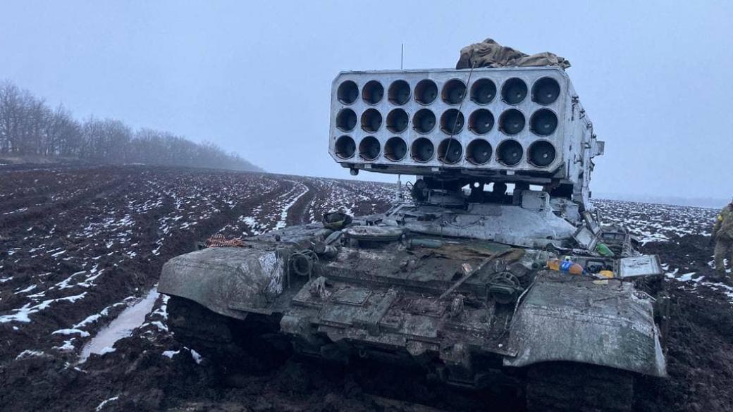 «Тяжелая огнеметная система залпового огня „Буратино"/"Солнцепек“. Была сегодня отбита ВСУ у российских оккупантов».