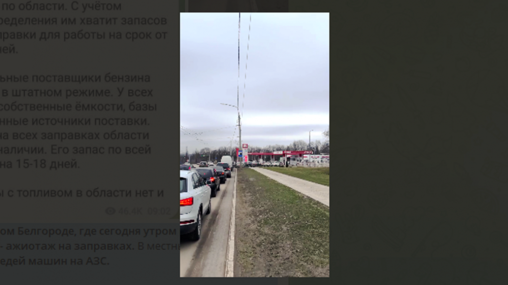 В российском Белгороде после масштабного пожара на нефтебазе наблюдается ажиотаж на заправках. Местные паблики публикуют видео очередей машин на АЗС.
