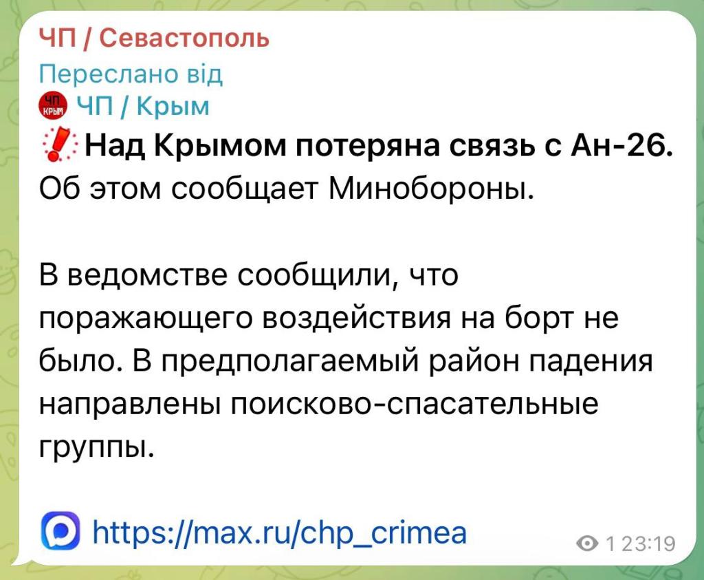 Минобороны сообщило, что около 18:00 по московскому времени потеряло связь с военно-транспортным самолетом Ан-26, который осуществлял "плановый перелет" над оккупированным полуостровом.