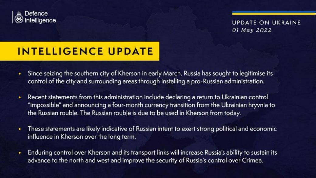 Как уточняет разведка, оккупационные «власти» заявляют о невозможности возвращения региона в Украину и с 1 мая вводят рублевое обращение. По мнению разведчиков, такие действия говорят о планах РФ установить свое политическое и экономическое влияние в Херсоне на долгосрочной основе. В оборонном ведомстве Британии добвии: