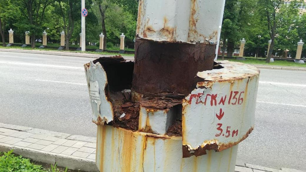 Он показал опору на пр. Ильича, которая проржавела насквозь. Местами ржавчина осыпалась, и ее можно набирать горстями. Столб находится напротив Донецкого мединститута.
