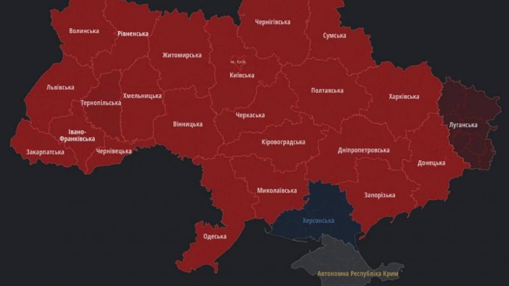 Практически по всей Украине, кроме временно оккупированных территорий, объявлена воздушная тревога. Сигнал тревоги означает ракетную опасность, в связи с чем граждан призывают пройти в ближайшее укрытие.