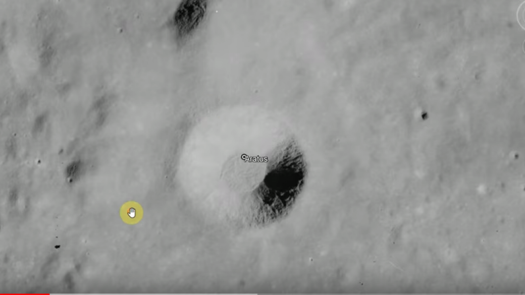 На стороне Луны, обращенной прямо к Земле, видна горная гряда Апеннины, на севере которой имеется ударный кратер Арат.