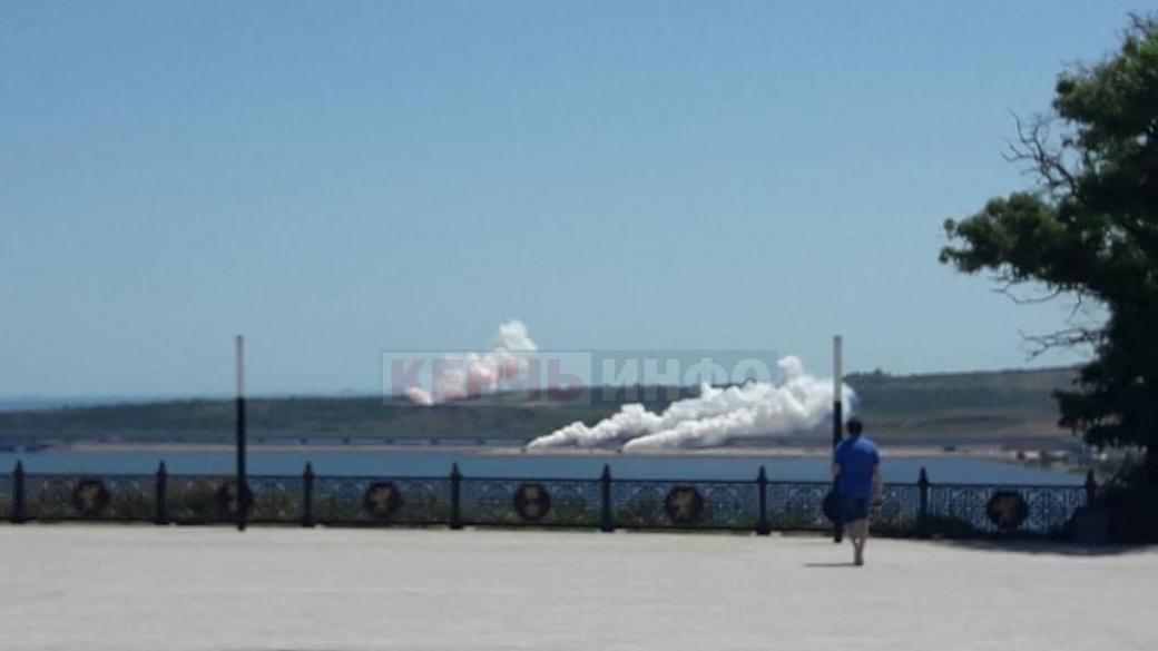 Очевидцы рассказывают о задымлении в районе съезда с Крымского моста и публикуют фото клубов дыма.