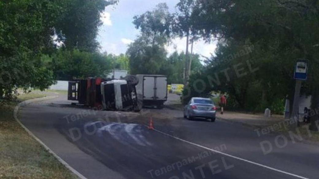 Во временно неподконтрольном украинскому правительству Донецке, на ул. Левобережной произощла авария и перевернулся мусоровоз, сообщают местные жители.