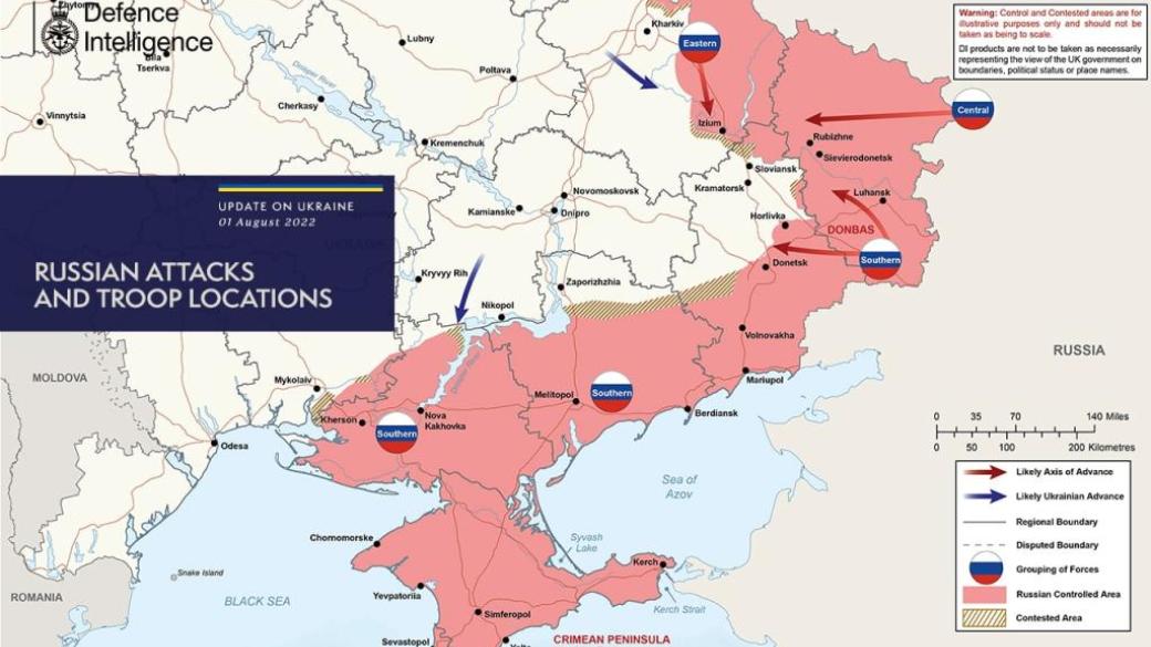 Российские войска продолжают наступление на востоке Украины и наносят ракетные удары по населенным пунктам Донецкой, Харьковской и Луганской областей. Об этом сообщает Минобороны Великобритании, публикуя актуальную карту боевых действий в Украине по состоянию на 1 августа.