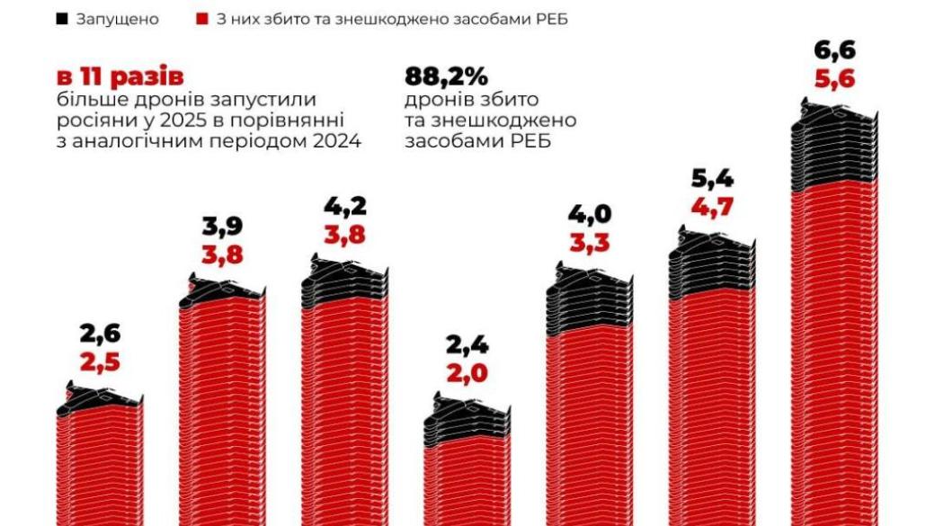 За семь месяцев 2025 года российские захватчики запустили по Украине 29 000 дронов, что в 11 раз больше, чем за аналогичный период 2024 года. Об этом заявили эксперты UA War Infographics.