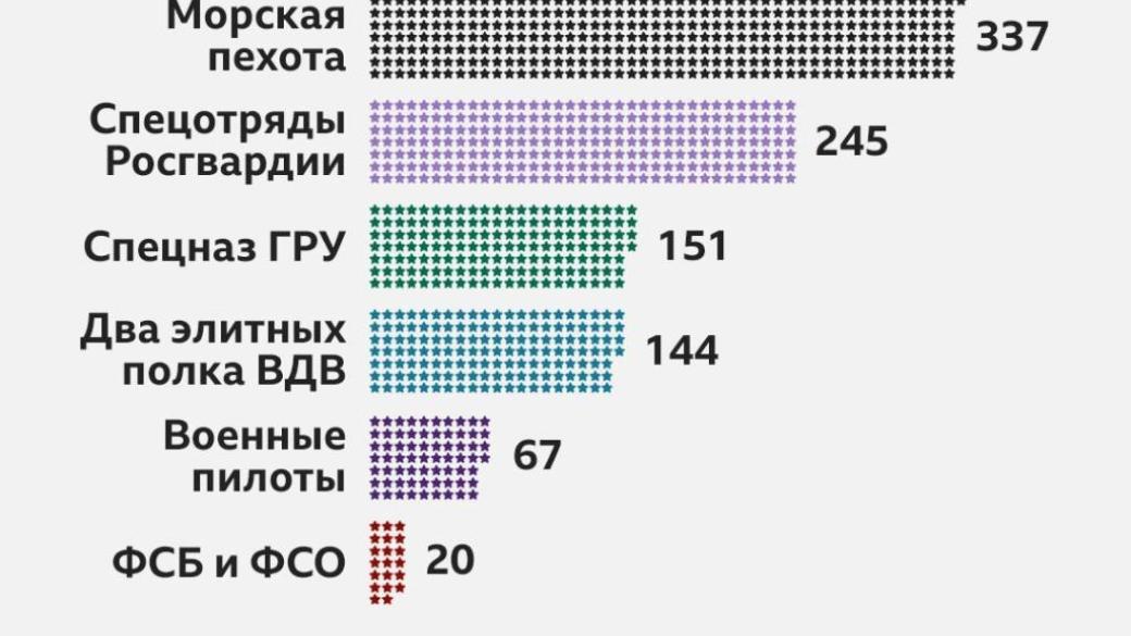 ВВС отмечает, что стало известно о гибели 337 "элитных военных специалистов" в морской пехоте, а также о 144 бойцах ВДВ. По оценке эксперта Центра военно-морского анализа Майкла Кофмана, на каждого погибшего российского военного в ходе войны в Украине приходится около 3,5 раненых.
