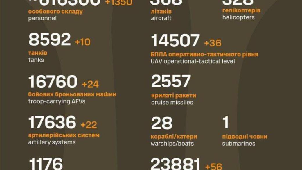 За минувшие сутки российские захватчики потеряли 1350 оккупантов и более 160 единиц техники.