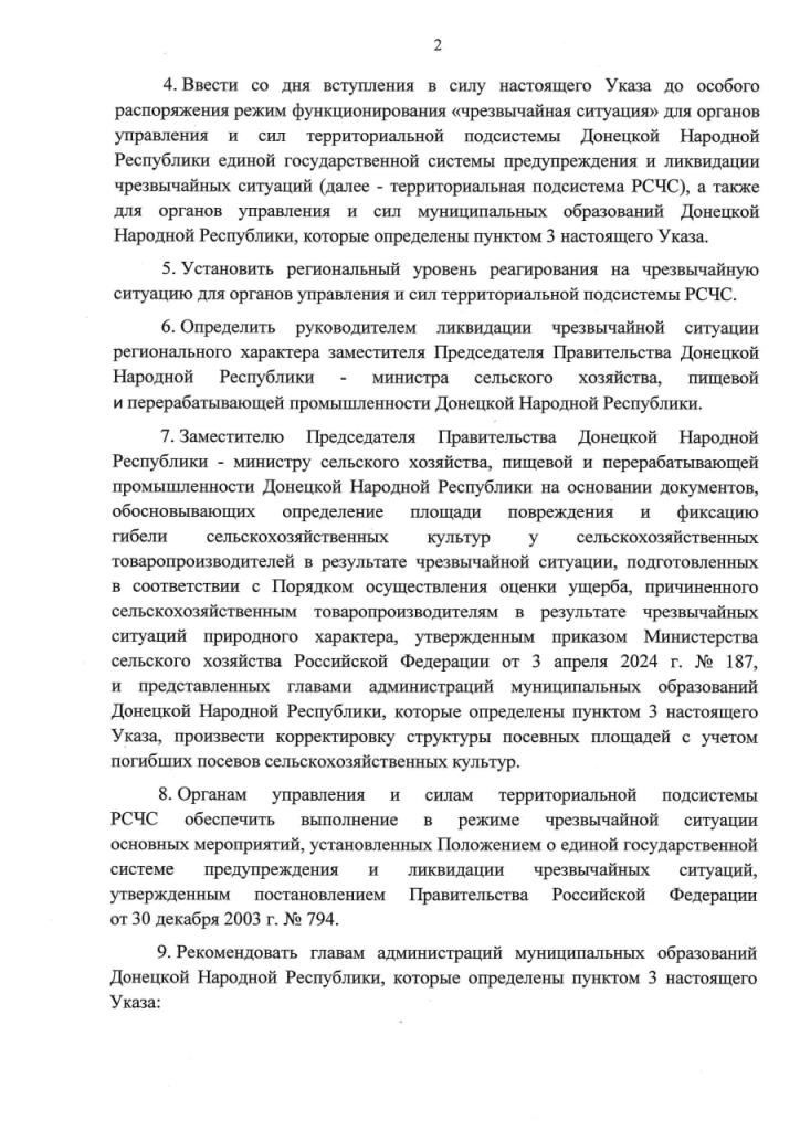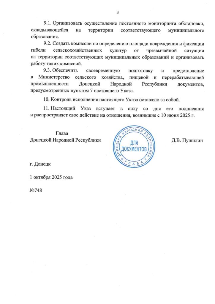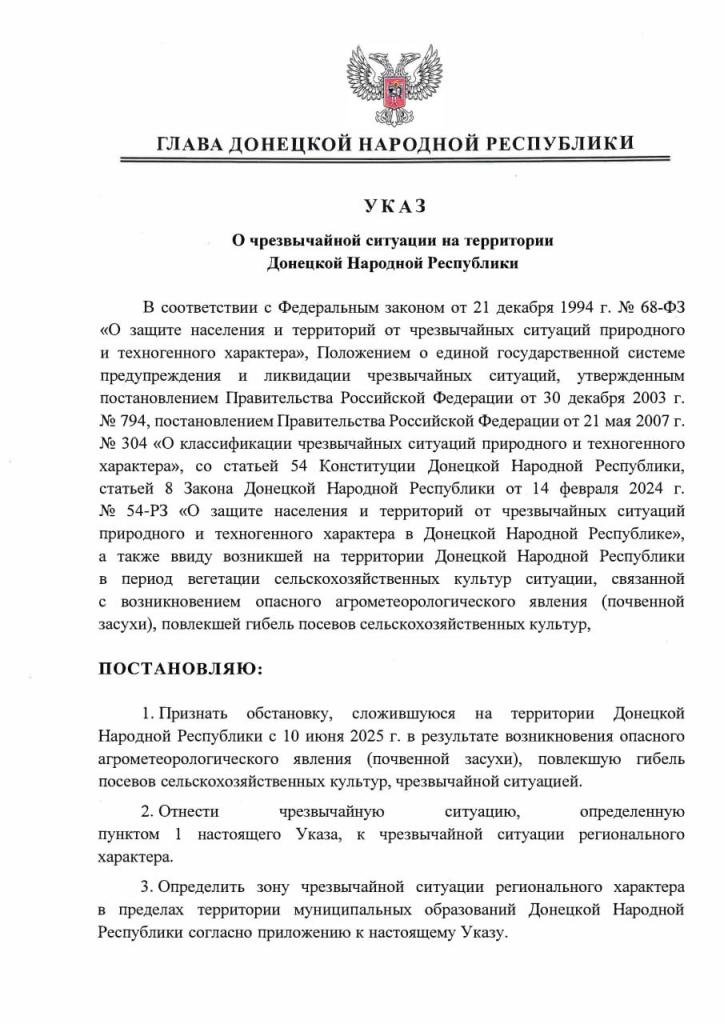 1 октября, глава группировки “днр” Денис Пушилин подписал указ, согласно которому обстановка, сложившаяся на оккупированной территории Донецкой области с 10 июня 2025 года «в результате возникновения почвенной засухи, повлёкшей гибель посевов сельскохозяйственных культур, признана чрезвычайной ситуацией». Об этом сообщают «Новости Донбасса».