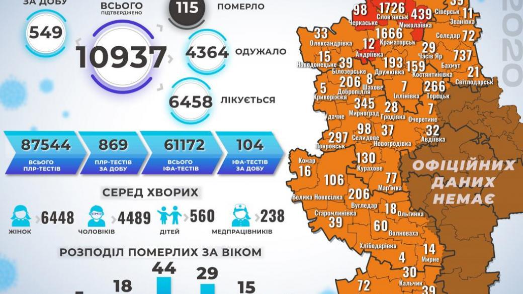 В Донецкой области зарегистрировано еще 549 инфицированных коронавирусом 12 человек скончались.