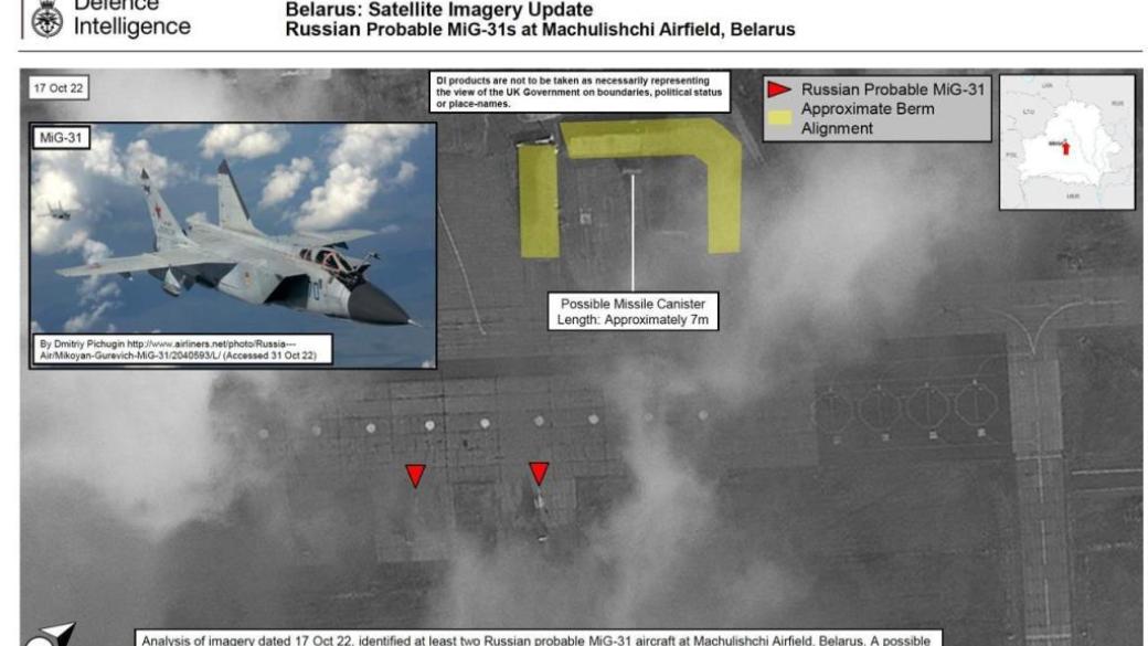 "Разведка предоставила спутниковый снимок аэродрома от 17 октября, где видны две единицы МиГ-31К ВКС рФ и 7-метровый ракетный контейнер, где, вероятно, могут храниться ракеты «Кинжал», дислоцирующиеся на аэродроме в Мачулищах".