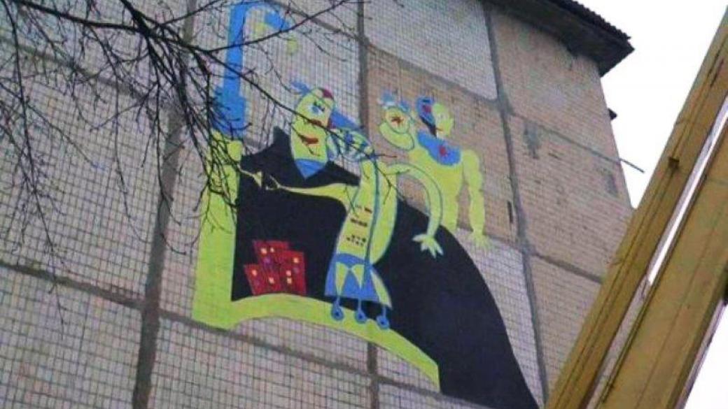 Сообщается, что на стене дома художник изобразил двух киборгов. В основу данного изображения вошли детские рисунки.