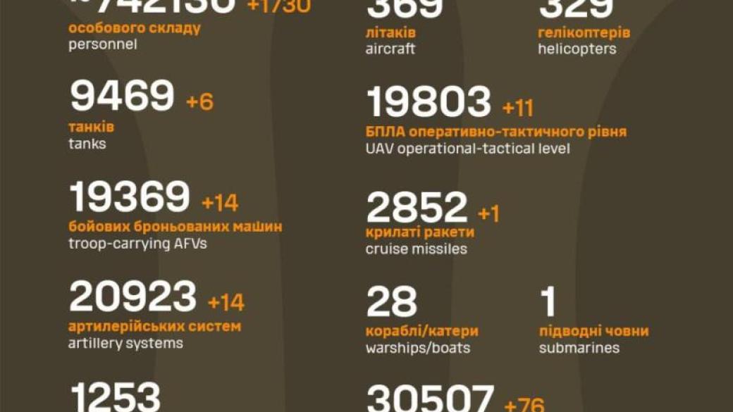 За прошедшие сутки украинские защитники ликвидировали 1730 захватчиков и десятки единиц техники врага.