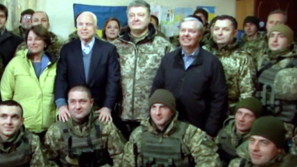 Пресс-секретарь гпрезидента Украины Святослав Цеголко опубликовал видео посещения Порошенко в компании американских сенаторов-республиканцев Джона Маккейна, Линдси Грэма и Эмми Клобучар позиции сил АТО неподалеку от Мариуполя.