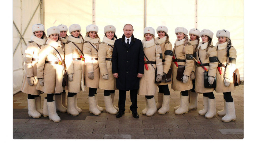 Пользователи сети высмеяли новое фото президента РФ Владимира Путина с женщинами в форме советских регулировщиц Военной автомобильной инспекции.