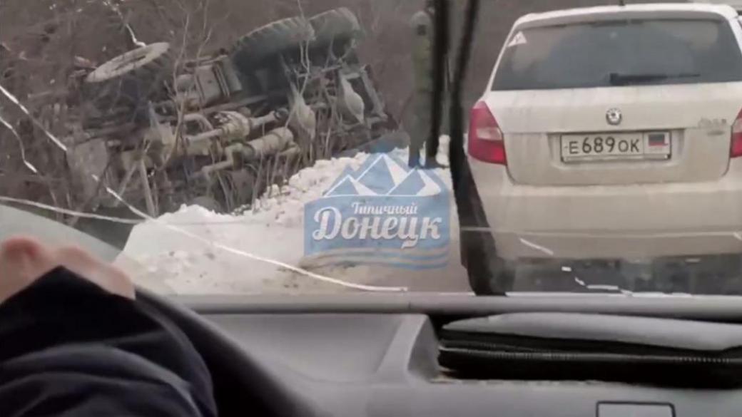 Предположительно про дороге в направление неподконтрольного Донецка двигалась колонна из трех «Уралов», перевозивших членов НВФ «ДНР». В результате ДТП один автомобиль развернуло поперек дороги, а другой — выехал за ее пределы на противоположную движению сторону и перевернулся на бок в кювет.