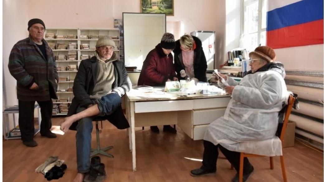 "Ярким подтверждением достижений современной российской медицины в «днр» является фото деэнеровского информагентства «ДАН», на котором изображен прием в одной из больниц Донецка. Обратите внимание, врач за семьдесят в очках с толстыми линзами, в верхней зимней одежде, по верх которой надет стерильный халат, принимает больного. Все врачи, как и другие пациенты, находятся в зимней одежде и в головных уборах? А почему? Так нигде же не отапливается!! Но если помещение не отапливается, то почему пациент босой ногой стоит на холодном и грязном полу, по которому ходят все пациенты и врачи в зимней обуви? Данное фото – это приговор достижениям российской медицины, путинскому режиму и его оккупационной власти в Донецке. А главное, посмотрите, какие у всех счастливые лица – россия пришла!".