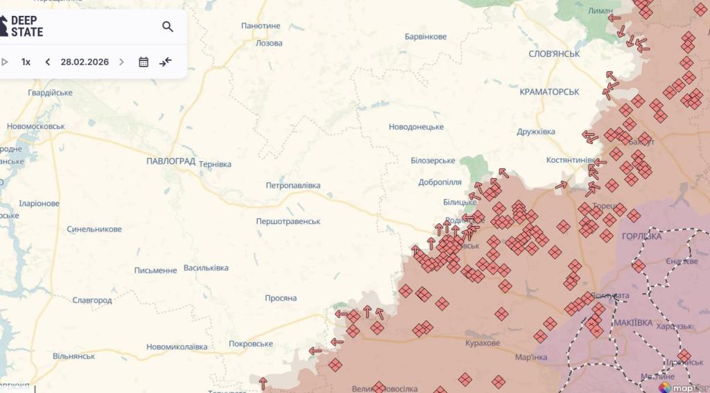 Больше всего войска рф продвинулись на Покровском направлении — 32% от захваченных территорий в феврале, на Славянском — 23%, на Краматорском — 16%, на Константиновском — 21%, на Сумском — 7%.