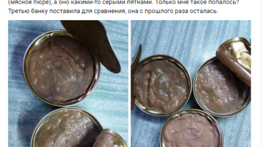 В сообществе «Буденновский/Пролетарский районы Донецк» в социальной сети ВКонтакте дончанка написала: «Получила гуманитарку на ребенка. Сегодня открыла 2 баночки детского питания (мясное пюре), а оно какими-то серыми пятнами. Только мне такое попалось? Третью банку поставила для сравнения, она с прошлого раза осталась».