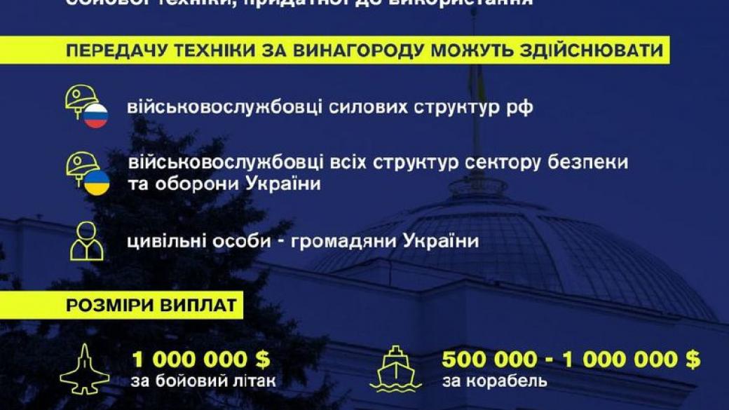 В ВР утвердили, что вознаграждение можно будет получить за передачу российской военной техники, пригодной к дальнейшему использованию.