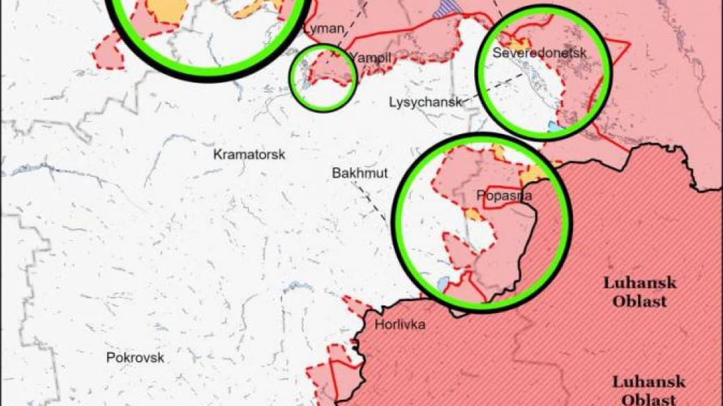По данным института, россияне также сражаются за контроль над Белогоровкой, где в начале мая предприняли дорогостоящую и неудачную попытку форсирования реки Северский Донец, и Врубовкой, так как это позволит им наступать на Лисичанск с запада.