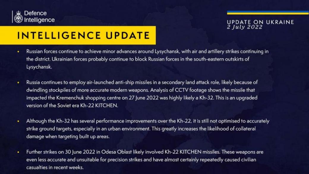 В то же время удары войск РФ 30 июня в Одесской области, скорее всего были сделаны ракетами Х-22. В британской разведке добавили, что оружие еще менее точное и непригодное для нанесения точечных ударов и неоднократно приводило к жертвам среди гражданского населения в последние недели.