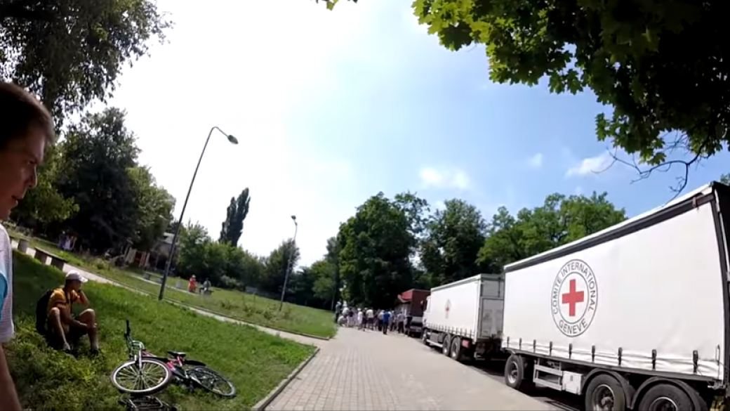 В ролике Полтавец общается с местным жителем, получившим гуманитарку, который рассказал правила получения помощи. По его словам, гумпомощь получают по паспортам и талонам. При этом на каждый талон можно получить набор из двух ящиков — с продуктами и средствами гигиены.