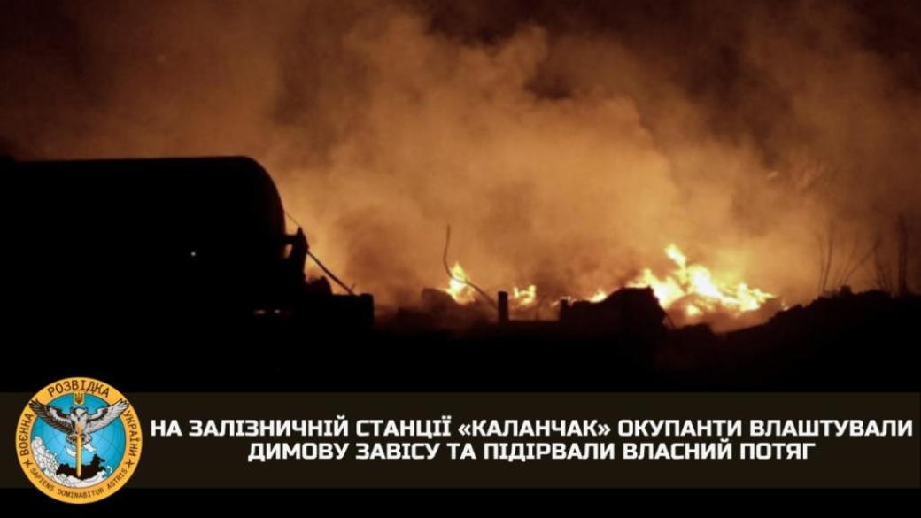 Военные РФ на железнодорожной станции «Каланчак» Херсонской области 31 августа устроили дымовой занавес и случайно взорвали собственный поезд. Об этом сообщает ГУР Минобороны Украины.