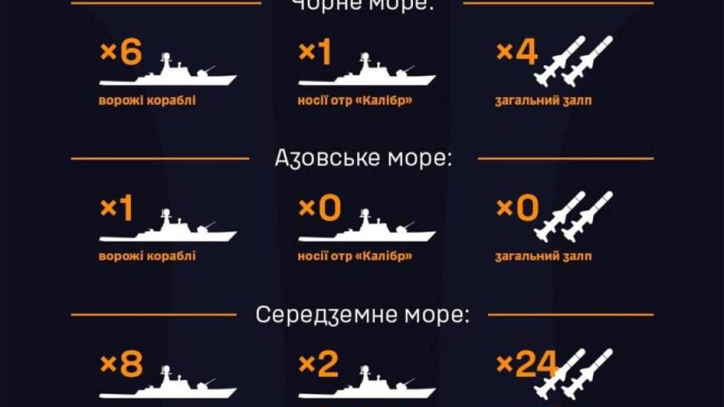 в Средиземном море на боевом дежурстве находится 8 вражеских кораблей, из них 2 носителя крылатых ракет "Калибр", общий залп до 24 ракет, сообщили в Военно-морских Силах Украины..