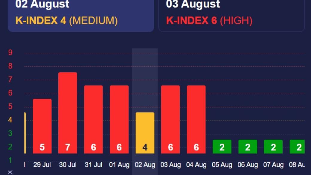 По данным сайта, магнитная буря затянется на два дня: 3 и 4 августа. Она будет сильная, К-индекс превысит 6. Выброс на Солнце может привести к появлению сильных полярных сияний.
