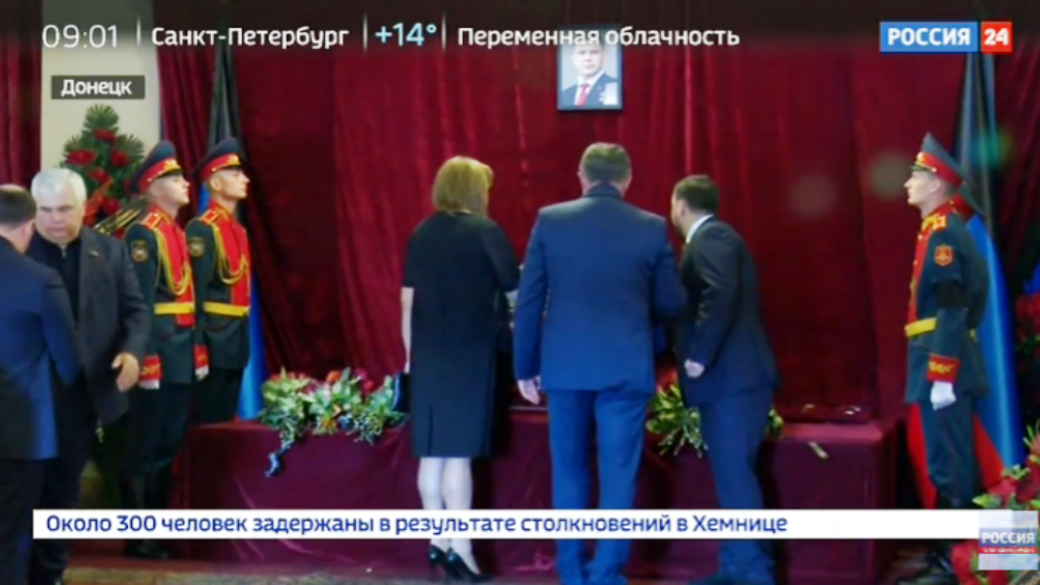 У гроба Захарченко стоят и.о. главы «ДНР» Дмитрий Трапезников, «глава парламента ДНР» Денис Пушилин, а также президент самопровозглашенной Южной Осетии Анатолий Бибилов. Также, ожидается визит «главы» аннексированного Крыма Сергея Аксенова и депутата нелегитимной Госдумы РФ Натальи Поклонской.