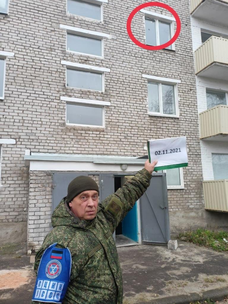 Данная пятиэтажка пострадала в ходе боевых действий в 2014 -2015 гг. и недавно была отремонтирована, жители 5 квартир вернулись в свои жилища. Пребывание людей в этом месте сопряжено с опасностью, так как недалеко проходит линия боевого столкновения.