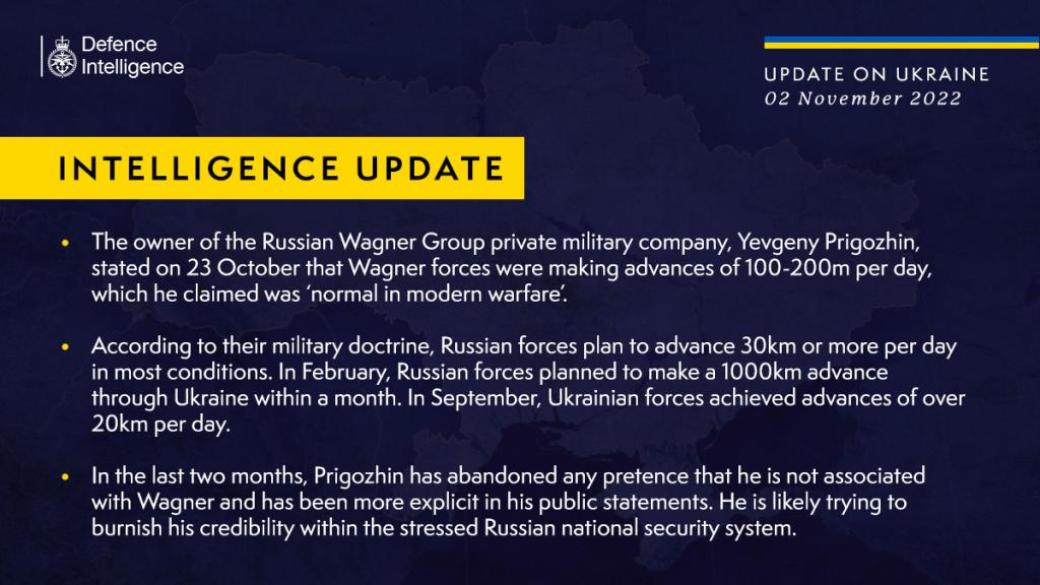 Как предполагает британская разведка, Пригожин в напряженной российской системе национальной безопасности пытается повысить свой авторитет . В ведомстве уточнили, что 23 октября Пригожин заявил, что силы ЧВК продвигаются вперед на 100-200 м в день, что якобы "нормально для современной войны".