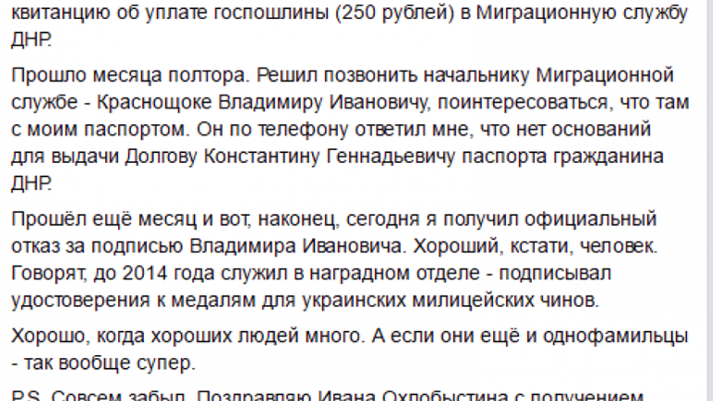 На своей странице в соцсети он пожаловался: «Мне отказали в получении паспорта гражданина «ДНР». Два с половиной месяца назад я сдал весь пакет документов, включая квитанцию об уплате госпошлины (250 рублей) в Миграционную службу «ДНР». Прошло месяца полтора. Решил позвонить начальнику Миграционной службе — Краснощоке Владимиру Ивановичу, поинтересоваться, что там с моим паспортом. Он по телефону ответил мне, что нет оснований для выдачи Долгову Константину Геннадьевичу паспорта гражданина «ДНР».