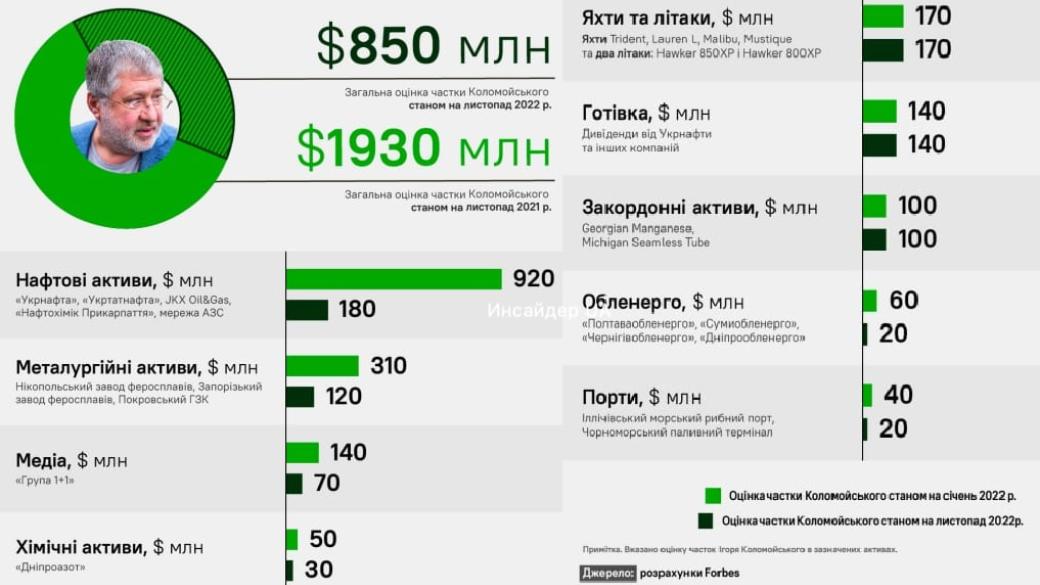 Если в 2021 году Forbes оценил его состояние в $1,8 млрд (тогда он занял 4 место в списке самых богатых людей Украины), то сейчас у Коломойского насчитывается только 850 миллионов долларов.