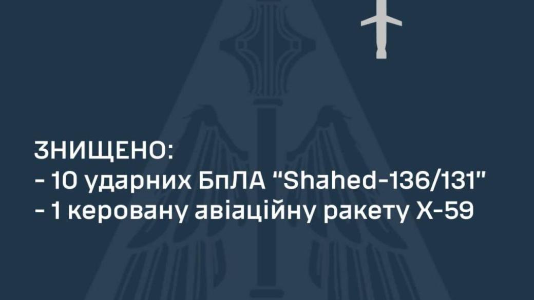 В результате боевой работы противовоздушной обороной Сил обороны Украины уничтожены 10 ударных БпЛА «Shahed-136/131» в пределах Одесской области и одна управляемая авиационная ракета Х-59 на Днепропетровщине.