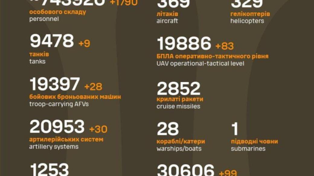 За прошедшие сутки защитники Украины ликвидировали 1790 оккупантов и уничтожили 249 единиц российской техники и вооружения.