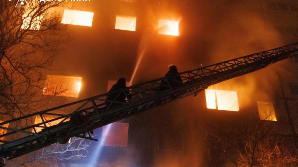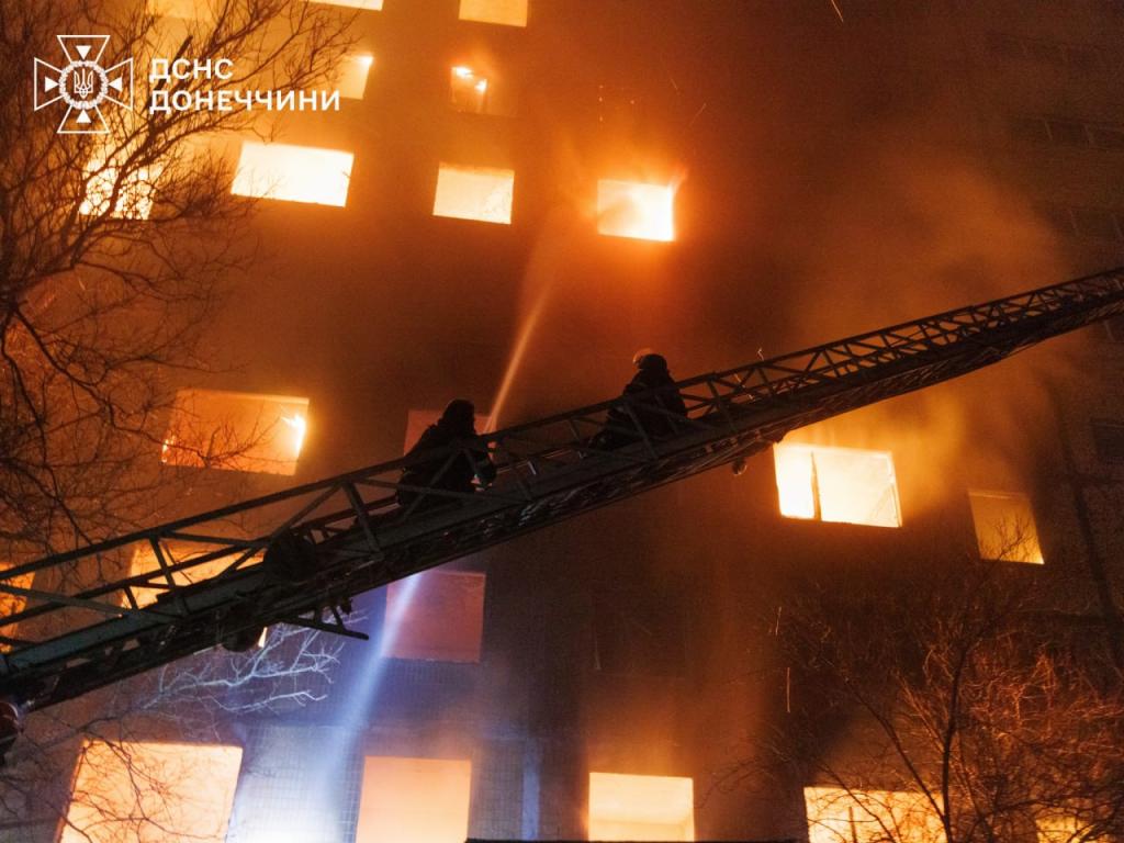 «Вчера вечером враг в очередной раз нанес удар беспилотником по Краматорску. Дрон попал в 9-этажный многоквартирный дом. Возник пожар квартир и балконов в двух подъездах с 1-го по 8-й этажи. Один человек погиб,» — говорится в сообщении ГСЧС.