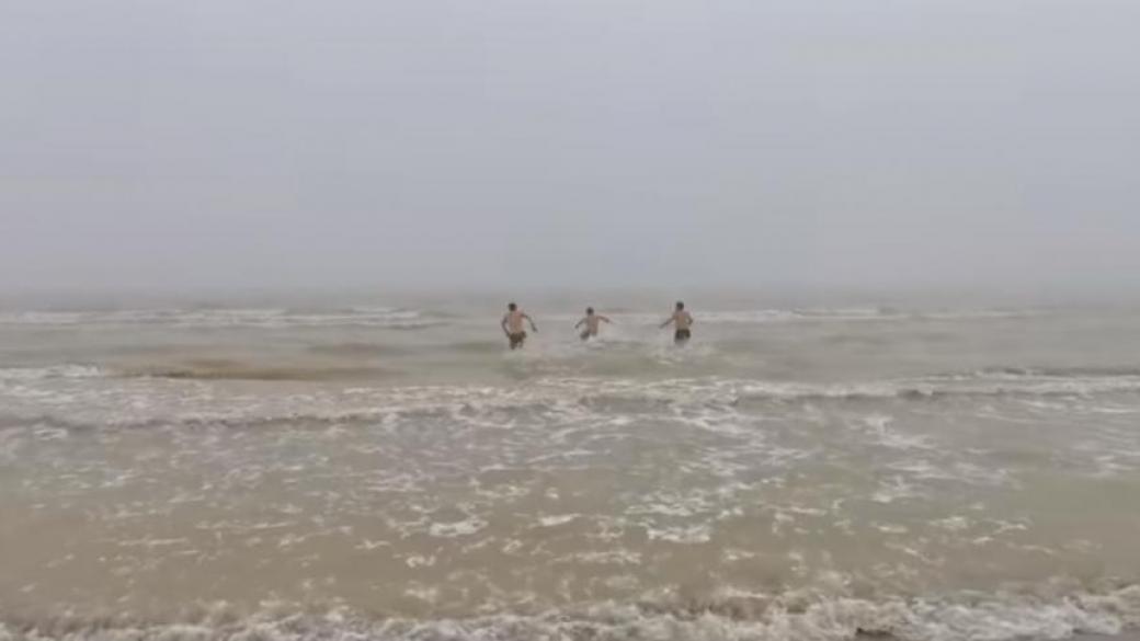 Температура воды в Азовском море едва превышает 0 градусов, но это не помешало мелитопольскому священнику Александру Богомазу и его гостям из столицы отправиться на берег моря и окунуться. Мужчины быстро забежали в море и провели в нем несколько минут.