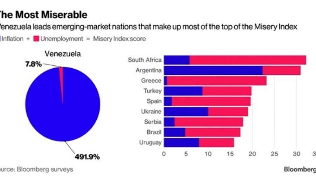 Лидером антирейтинга в третий раз подряд с огромным отрывом заняла Венесуэла. При сравнительно низком уровне инфляции в 7,8 процента государство подвержено гиперинфляции. Вслед за ней в топе идут ЮАР и Аргентина.