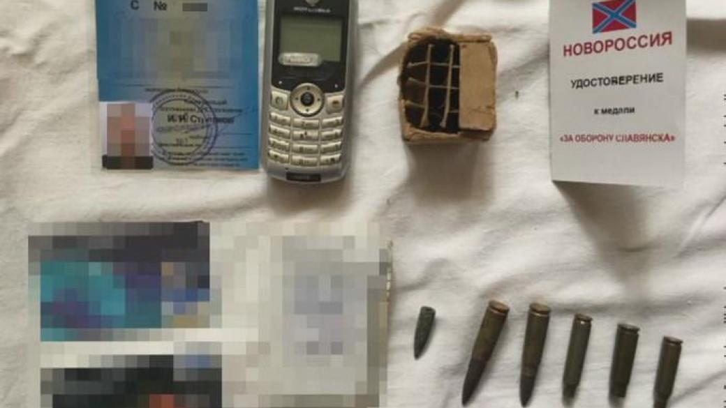 Во время обыска у боевика правоохранители изъяли две гранты Ф-1, одну гранату РГД-5, более 60 патронов к стрелковому оружию, удостоверение боевика «ДНР», удостоверение о награждении наградой «за оборону Славянска», средства связи и банковские карты.