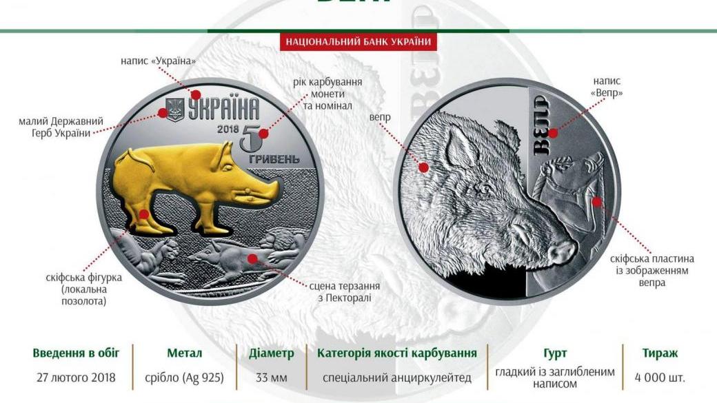 НБУ с 27 февраля ввел в обращение памятную монету «Вепрь» номиналом 5 грн.