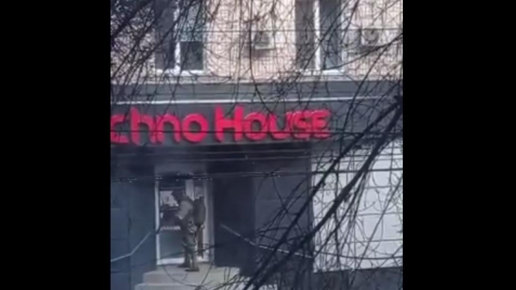 Украинцы показали видео, в котором российский оккупатнт пытается взломать двери магазина бытовой техники.