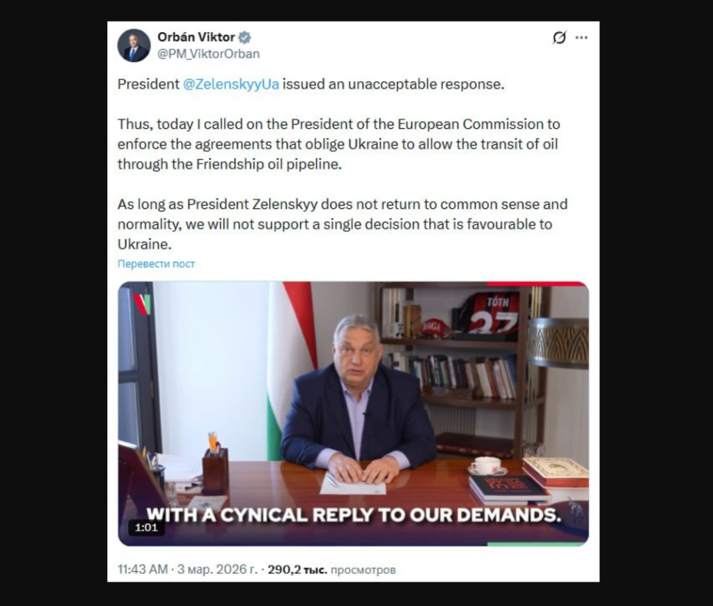 «Ответ президента Зеленского был недопустимым. В связи с этим я сегодня обратился к главе Европейской комиссии с просьбой обеспечить соблюдение договоренностей, которые обязывают Украину разрешить транзит нефти через нефтепровод «Дружба». До тех пор, пока президент Зеленский не проявит разумный подход и не вернется к нормальному диалогу, мы не будем поддерживать ни одно решение, выгодное для Украины», – заявил Орбан в социальной сети Х.